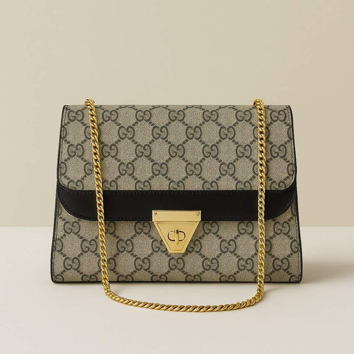 The structured silhouette is complemented by a gleaming gold-tone clasp and a polished chain strap, offering versatility and comfort whether worn over the shoulder or as a crossbody. The interior is thoughtfully designed with ample space for essentials, making it as practical as it is chic.